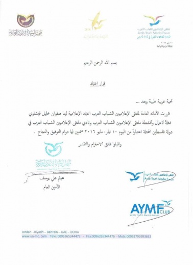 اعلنت الامانة العامة لملتقى الاعلاميين الشباب العرب اعتماد الاعلامية لينا قيشاوي ممثلةً لأعمال وأنشطة ملتقى الاعلاميين الشباب العرب ونادي ملتقى الإعلاميين الشباب العرب في دولة فلسطين المحتلة اعتبارا من اليوم الموافق 10 ايار / مايو 2016 .
