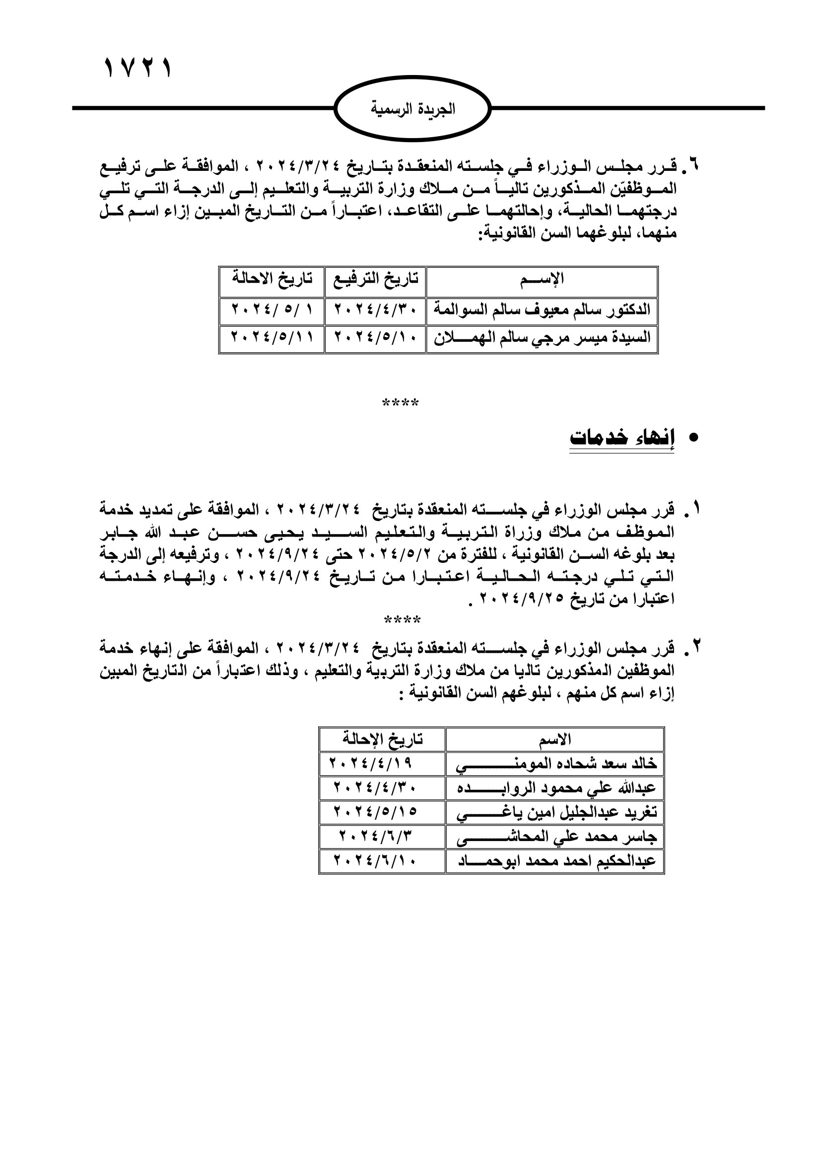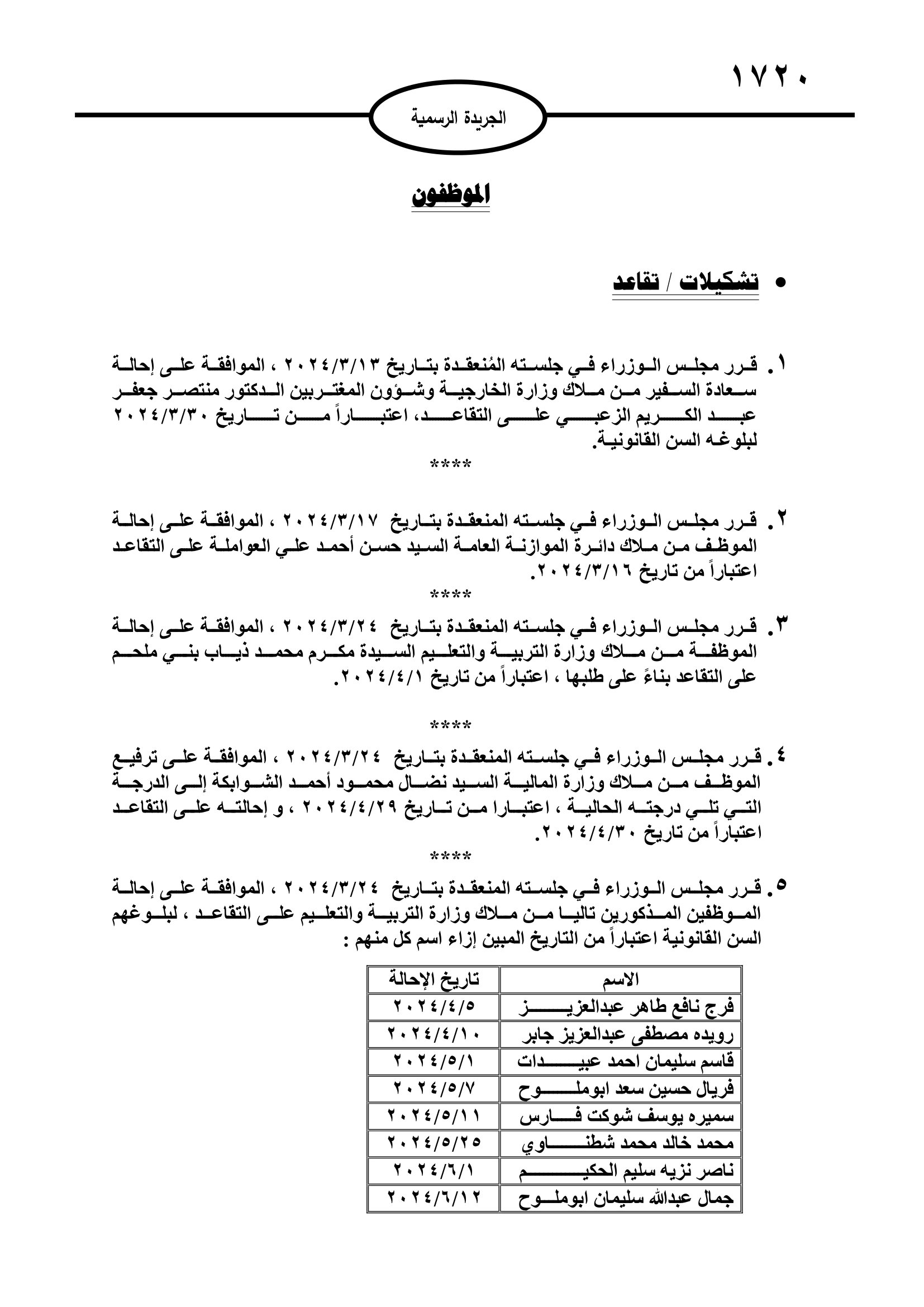 صدر في عدد الجريدة الرسمية اليوم الاثنين #قرارات #مجلس_الوزراء بالموافقة على #احالة #موظفين #حكوميين إلى #التقاعد، وانهاء خدمات اخرين.