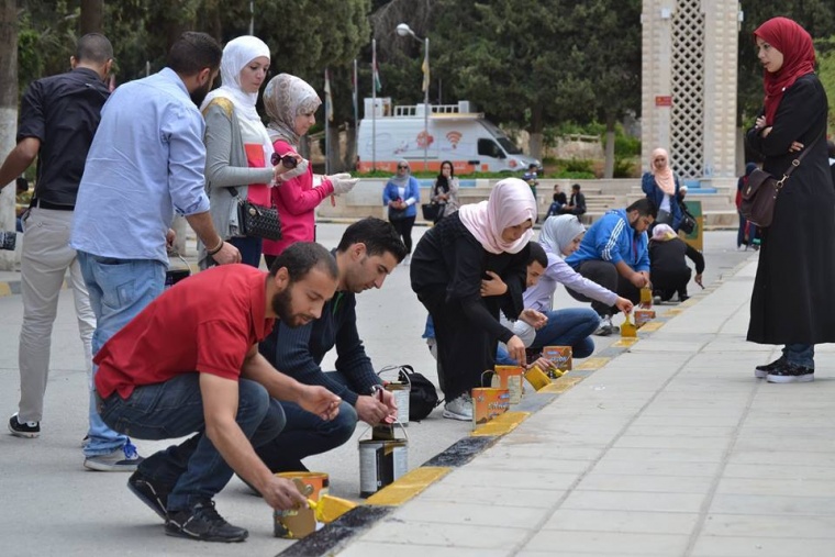 وشارك بالفعالية عشرات الطالبات والطلبة، حيث تم طلاء أرصفة الشوارع الرئيسية الداخلية للجامعة.