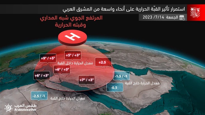 و تأتي الموجة الحارة المُتوقعة الأسبوع القادم على دول الخليج، بسبب أن القبة الحرارية التي يتسبب بها المرتفع العلوي العربي الموسمي تمنع الرياح نهاراً من ارتداد الحرارة في الغلاف الجوي، فتبقى حبيسة الطبقات السفلية ضمن إطار هذه القبة الحرارية (و هي تكون على شكل قبة و غطاء)، فمع استمرار التسخين الشمسي نشعر بالحرارة الشديدة خلال ساعات النهار و بالذات في المناطق الحضرية حيث المدن الإسمنتية، إذ أن الطرق و المباني تمثل أحد الأسباب التي تزيد من تأثيرها.