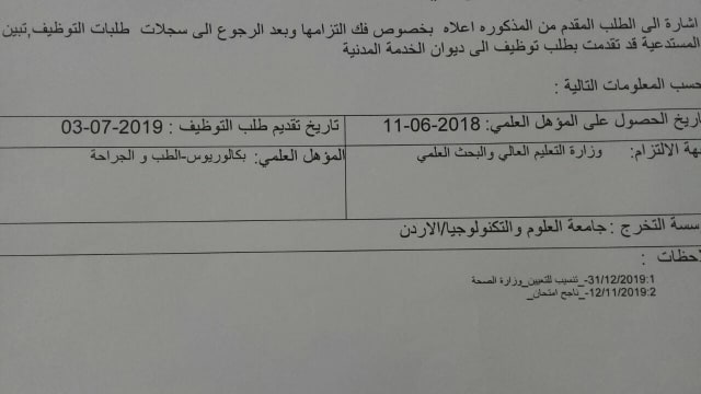 ناشدت مجموعة من أطباء الاسنان والطب العام وزارة الصحة عبر موقع سواليف لاتخاذ اجراء حول قرار تعيينهم في المستشفيات الحكومية وذلك بعد اصدار كتاب تنسيبهم بتاريخ 29/12/2019 والذي تضمن توزيع 140 طبيبا كلا ضمن اختصاصه على المستشفيات وتم اصدار قرار التعيينات في الصحف الرسمية باسمائهم ولم يتم العمل بهذا القرار لتاريخ كتابة هذه السطور .