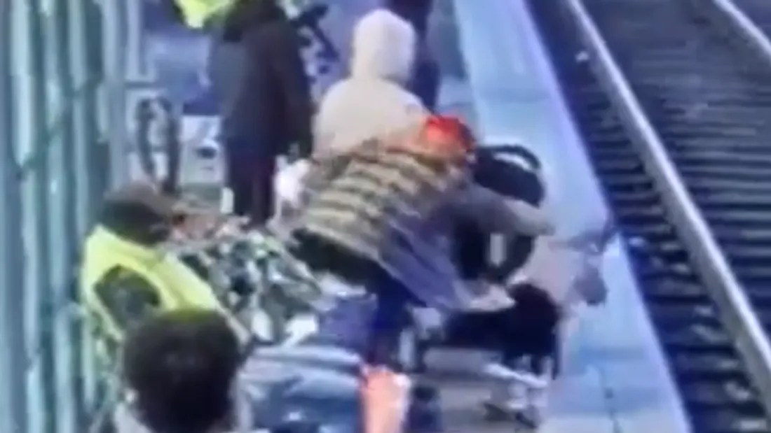 وسقطت الطفلة على وجهها أولا على القضبان، ليهب بسرعة الرجل الذي كان يجلس بجوارها لإنقاذها، إلى جانب الأم.
