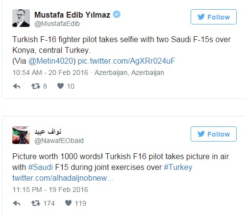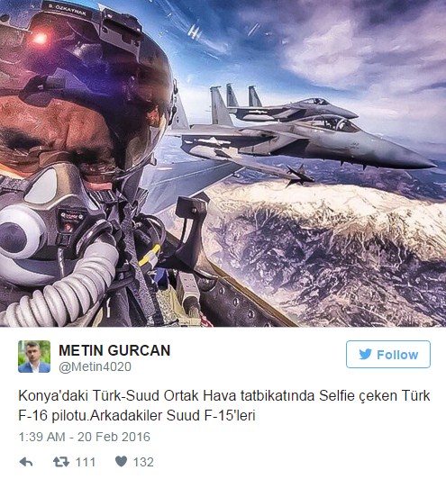 والتقط الطيار التركي السيلفي وهو في قمرة طائرته عندما كانت تحلق جنبا إلى جنب مع سرب من المقاتلات السعودية في تركيا، وهي الصورة التي انتشرت سريعا في وسائل التواصل الاجتماعي التركية.