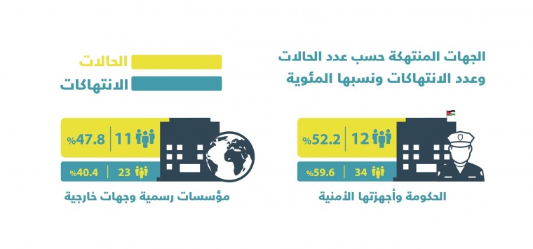 وأظهرت البيانات أن الانتهاكات الماسة في الحق بحرية الرأي والتعبير والإعلام قد جاءت بالمرتبة الأولى، بمعدل 18 انتهاكاً، وبنسبة بلغت 31.6% من مجموع الانتهاكات الموثقة، فيما حل في المرتبة الثانية الانتهاكات الماسة في الحق بالحرية والأمان الشخصي بمعدل 15 انتهاكاً وبنسبة 26.3% من مجموع الانتهاكات.