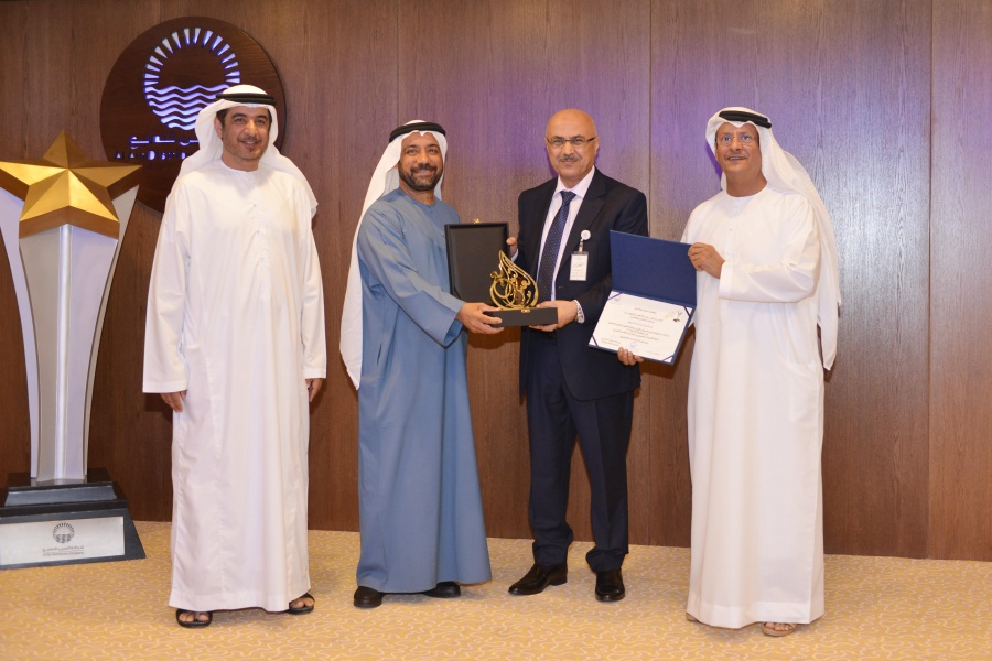 وسلم رئيس مجلس إدارة هيئة مياه وكهرباء أبو ظبي ورئيس مجلس إدارة شركة العين للتوزيع ومدير عام شركة العين للتوزيع الفائزين الجوائز وشهادات الشكر والتقدير في حفل جائزة الشركة للتميز.