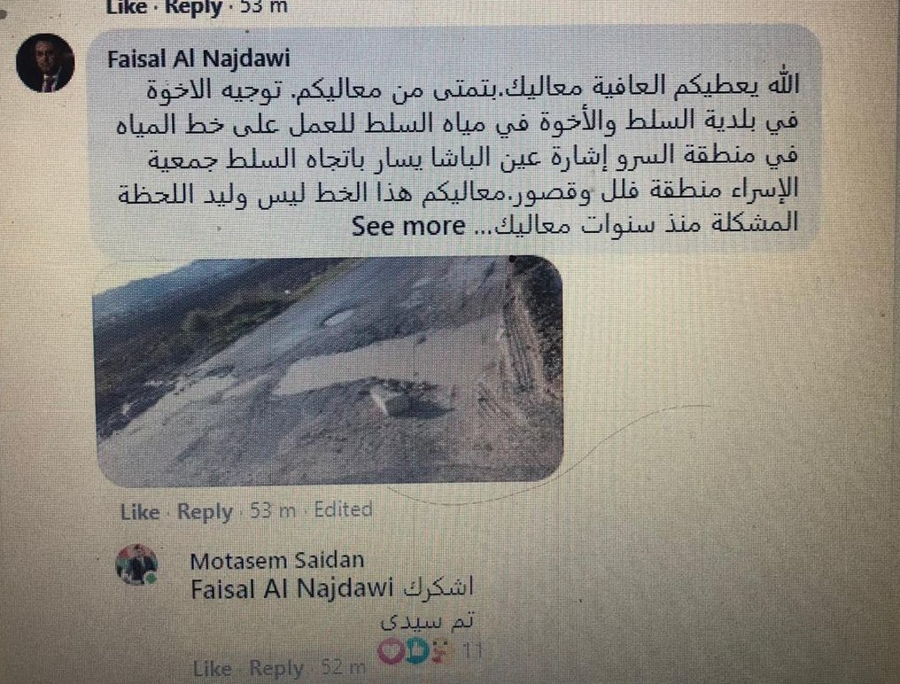 طالب احد المواطنين من وزير المياه عبر صفحته الشخصية على الفيسبوك توجيه بلدية السلط العاملين في مياه السلط للعمل على خط المياه في منطقة السرو إشارة عين الباشا.